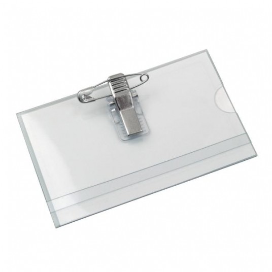 - identyfikator z przezroczystego, sztywnego tworzywa - wyposażony w klips sprężynujący i niewielką agrafkę - w komplecie kartonik z wydrukowaną ramką, grubość folii: 350 mic.