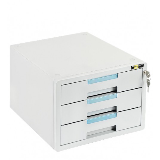 – plastikowa – zamykana na klucz: wszystkie szuflady – 3 szuflady A4 – okna opisowe – przydatna w realizacji przepisów RODO – otwory wentylacyjne z tyłu szafki – wymiary: 210 x 355 x 300 mm