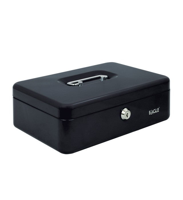 – metalowa kasetka lakierowana, o zaokrąglanych brzegach – zamykana na kluczyk (w zestawie 2 kluczyki) – posiada plastikową tackę z 5 przegródkami – wymiary: 82 x 192 x 262 mm