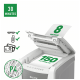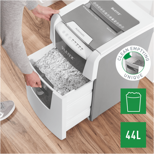 - duży, 44-litrowy pojemnik na ścinki pomieści po pocięciu wszystkie dokumenty, które załadowane zostały do komory podajnika