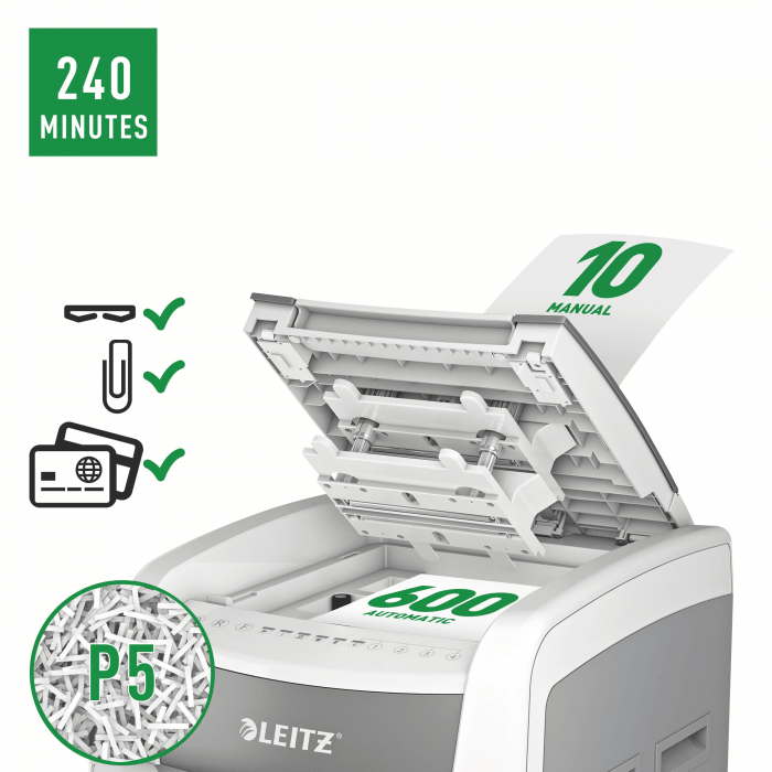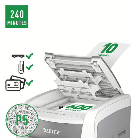 - niezwykle cicha praca urządzenia - gwarantuje niezakłócony spokój w miejscu pracy (pod warunkiem regularnego stosowania arkuszy Leitz do oliwienia ostrzy)
