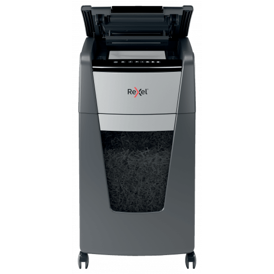 - jednorazowo niszczy automatycznie do 225 kartek A4 (80 gsm), tnąc arkusze na mikrościnki (o wymiarach 2 x 15 mm), co zapewnia poziom bezpieczeństwa P-5