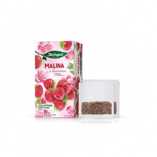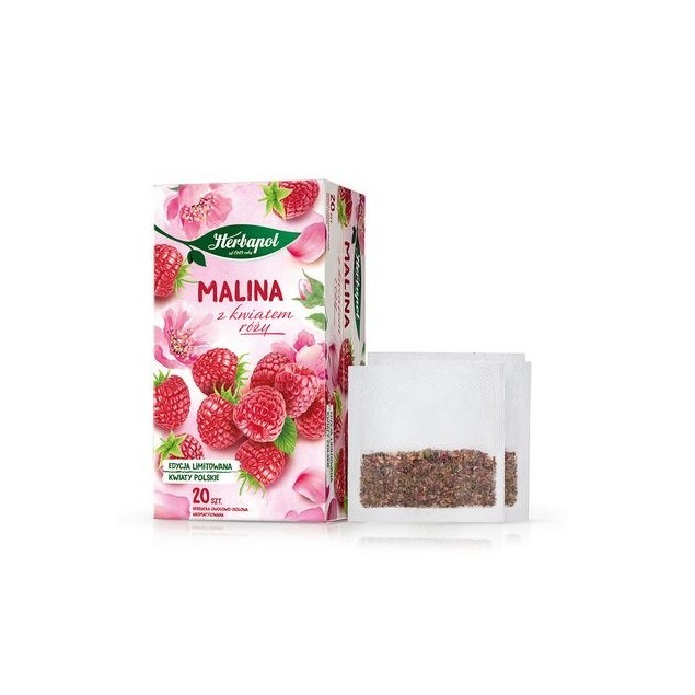 Herbatka owocowo-ziołowa aromatyzowana o smaku maliny z kwiatem róży.