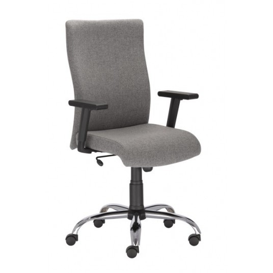 Krzesło biurowe z mechanizmem TILT, obustronnie tapicerowanym oparciem oraz regulowanymi podłokietnikami w kolorze szarym.