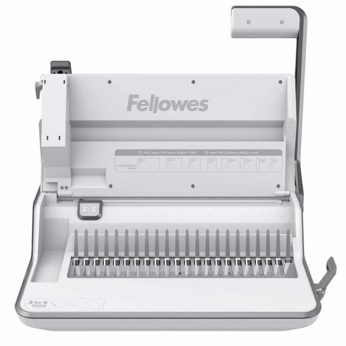 Fellowes Lyra 3 w 1 to funkcjonalne i wytrzymałe centrum oprawy dokumentów grzbietami plastikowymi (bindowanie, zszywanie i dziurkowanie dokumentów w jednym urządzeniu) do użytku w małym biurze: