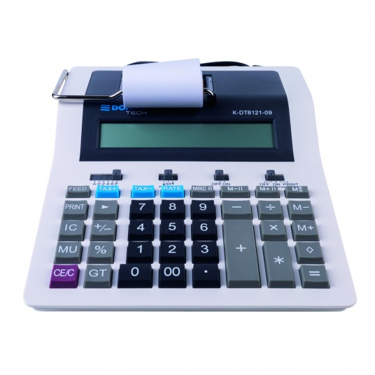 Kalkulator drukujący Kolor: Biały; Wymiary: 267mm x 202mm x 77mm; Zasilanie: Bateria; Szerokość papieru: 58mm; Drukowanie w dwóch kolorach: niebiesko–czerwonym; Posiada 12cyfrowy wyświetlacz; Wyłącza się automatycznie.