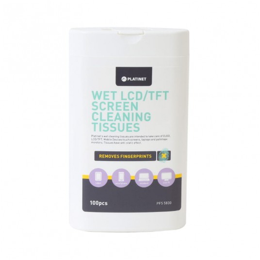 Chusteczki czyszczące do monitorów TFT/LCD. 100 nawilżanych chusteczek marki Platinet idealnie nadających się do czyszczenia monitorów i telewizorów LCD/TFT. Usuwają tłuste plamy, odciski palców i inne zanieczyszczenia, jednocześnie są bezpieczne i nie uszkadzają ekranu. Pozostawiają antystatyczną powłokę zabezpieczającą przed ponownym osadzaniem się brudu.