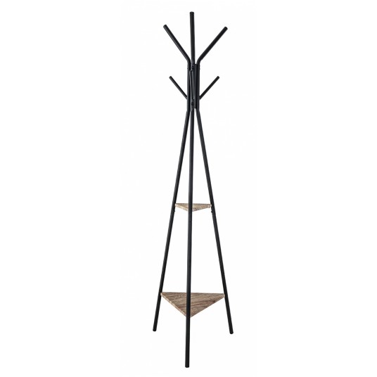 wieszak stojący na odzież wierzchnią nowoczesny design wykonany z wytrzymałej stali malowanej proszkowo posiada 6 haczyków do odwieszania ubrań dwie dodatkowe półki z MDF na akcesoria idealnie sprawdzi się w domowym wnętrzu, poczekalni czy biurze wymiary: 50x180cm kolor: czarny