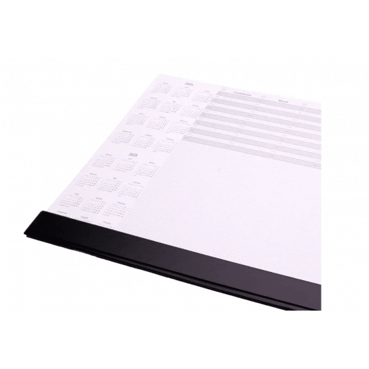 Biuwar na biurko z kalendarzem dwuletnim. - oryginalny projekt zgodny z zasadami organizacji czasu pracy - ilość kartek: 30 - listwa ochronna zabezpiecza kartki przed zaginaniem, posiada specjalną spodnią warstwę umożliwiającą przyssanie do podłoża, bez możliwości przesuwania się wkładu - przeznaczony do zapisywania notatek i rysunków - wymiary: 590 x 395 mm