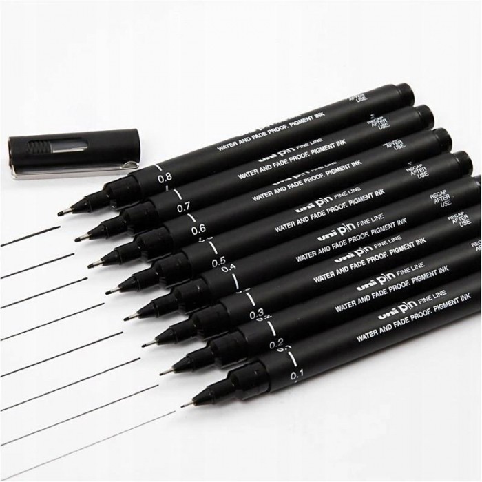 - w kolorze czarnym dostępne grubości: 0,03 mm, 0,05 mm, 0,1 mm, 0,2 mm, 0,3 mm, 0,4 mm, 0,5 mm, 0,6 mm, 0,7 mm, 0,8 mm, 0,9 mm, 1,0 mm, 1,2 mm oraz pędzelek