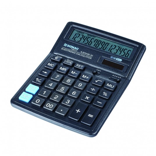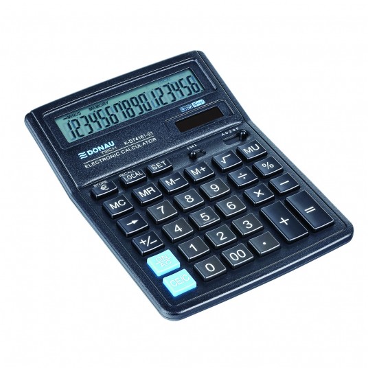 - kalkulator z 16-cyfrowym wyświetlaczem z zasilaniem bateryjno-solarnym - wymiary: 142 x 193 x 39 mm - posiada funkcję pierwiastka kwadratowego oraz obliczania procentów, obliczanie marży MU, podwójne zero, kasowanie ostatniej pozycji, pamięć, ustawienie dziesiętne, zaokrąglanie wyniku, konwersja walut - wyłącza się automatycznie - 5 lat gwarancji - kolor czarny