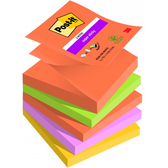 Kolekcja 4 wyjątkowych kolorów karteczek: Energetyczna Pomarańcza, Limonkowo Zielony, Tropikalny Róż oraz Słoneczny Żółty. 2x większa siła kleju Super Sticky vs klasyczne karteczki Post-it®.