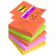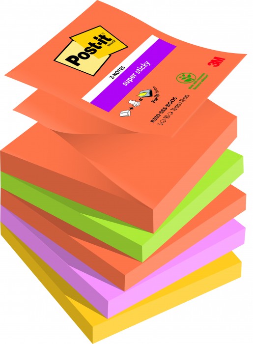 Kolekcja 4 wyjątkowych kolorów karteczek: Energetyczna Pomarańcza, Limonkowo Zielony, Tropikalny Róż oraz Słoneczny Żółty. 2x większa siła kleju Super Sticky vs klasyczne karteczki Post-it®.