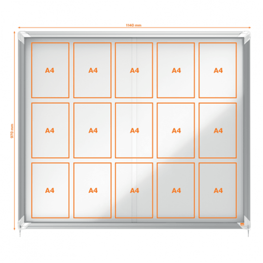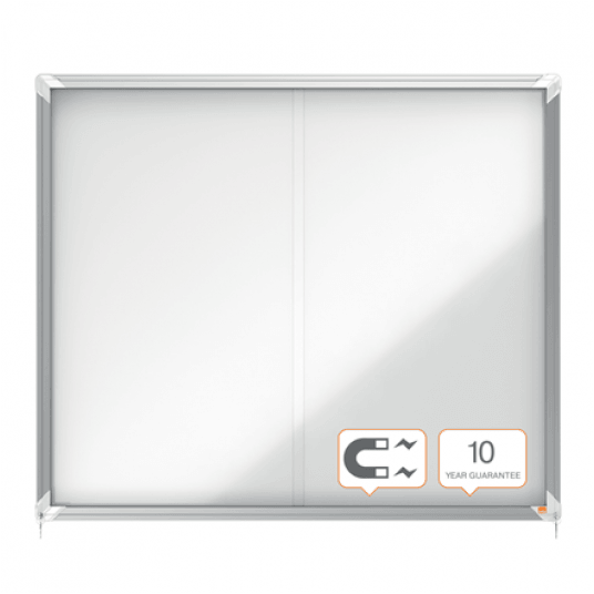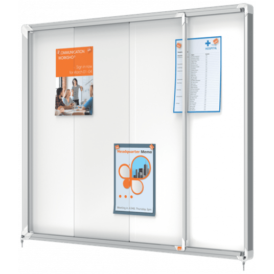 Zamykana gablota informacyjna z białą magnetyczną powierzchnią i przesuwanymi drzwiczkami z wytrzymałego, bezpiecznego szkła o grubości 4 mm. Zamieszczone w niej informacje będą bezpieczne i suche bez względu na panujące warunki atmosferyczne. Odpowiednia dla dokumentów w formatach będących wielokrotnością arkuszy A4.