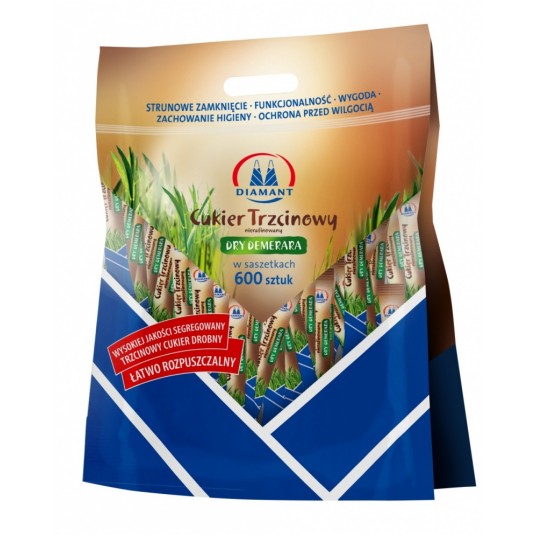 cukier trzcinowy pakowany w podłużne estetyczne saszetki