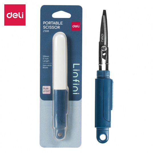 Kompaktowe nożyczki w bezpiecznym etui Deli Linfini EZ508 niebieskie długość 125 mm ostrza ze stali nierdzewnej zapobiegające przyklejaniu się materiału ergonomiczne, symetryczne uchwyty z plastiku ABS zaokrąglone końcówki dla bezpieczeństwa antykorozyjne – odporne na rdzę poręczny rozmiar – łatwe do przenoszenia zapakowane w blister idealne do prac biurowych, szkolnych i domowych