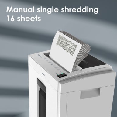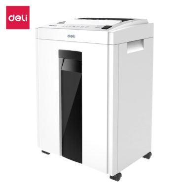 Niszczarka Deli ET053 '- szerokość wejścia: standard A4 - ilość niszczonych kartek (A4/70g): 16 arkuszy jednorazowo - czas ciągłej pracy: 10 minut - pojemność kosza na ścinki: 23 l - wielkość ścinka: 4 × 25 mm - poziom bezpieczeństwa wg DIN 66399: P-4 – wysoki poziom ochrony danych - mocny silnik – niezawodna praca nawet przy dużym obciążeniu - niski poziom hałasu – idealny do pracy w biurze - niszczy zszywki, spinacze i karty plastikowe - wymiary urządzenia: 350 × 250 × 550 mm