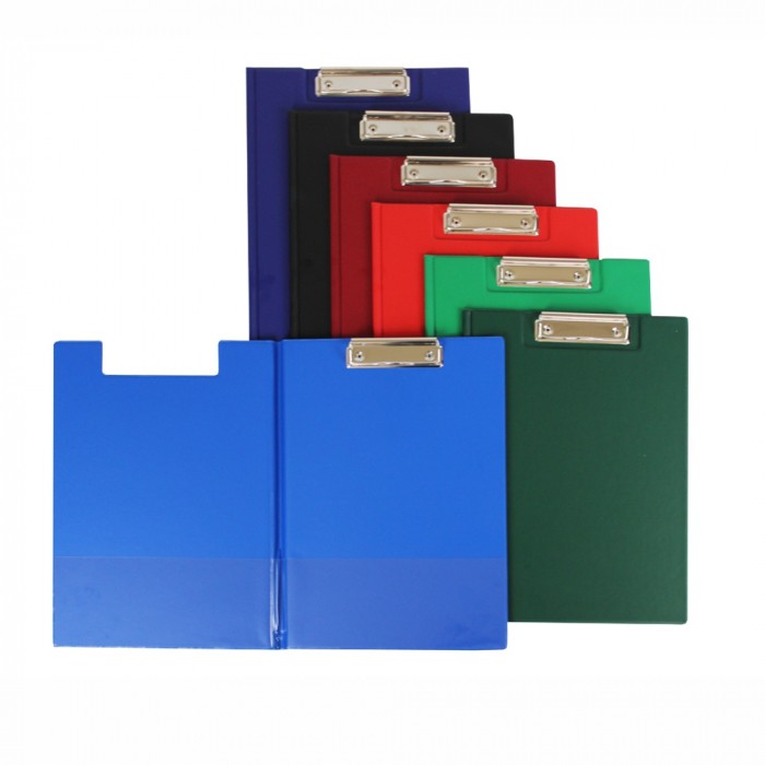 - wykonany z kolorowej folii PVC - środek usztywniony tekturą - wyposażony w sprężysty mechanizm zaciskowy służący do przytrzymywania kartek - kieszeń na wewnętrznej stronie okładki i miejsce na długopis - teczka zamykana