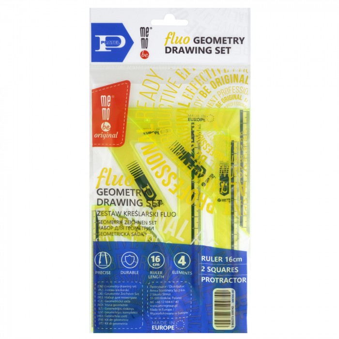 Zestaw kreślarski MemoBe by Pratel. Wersja fluorescencyjna. Praktyczne artykuły biurowe i kreślarskie wykonane z najwyższej jakości polistyrenu z nieścieralnymi podziałkami i precyzyjnym nadrukiem skali (do 1/1000 cm). Produkty mają zaokrąglone rogi dla bezpieczeństwa użytkownika. Wykonane z plastiku o odpowiednim stosunku twardości do elastyczności zapewniającym wysoką odporność na złamania. Zestawy przeznaczone zarówno do użytku szkolnego, biurowego, jak i w profesjonalnych biurach technicznych. Zestaw zawiera: linijkę 16 cm, ekierkę ze skalą 10 cm i 14 cm oraz kątomierz 180 stopni.
