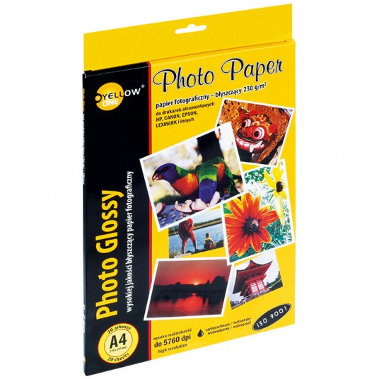 Papier foto Yellow One ze specjalną powłoką o brylantowej bieli zapewnia idealne wydruki fotograficzne w naturalnych kolorach – wodoodporny i szybkoschnący – zdjęcia wyróżniają się ostrością oraz imponującym kontrastem – rodzaj papieru: błyszczący – do drukarek atramentowych – zgodny z normą ISO 9001 – maksymalna rozdzielczość druku: 5760 dpi – format A4 – 230 g/m2 – opakowanie zawiera 20 arkuszy