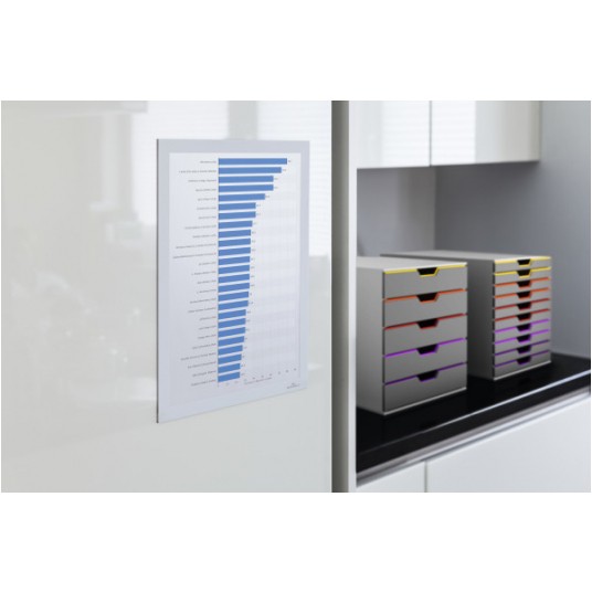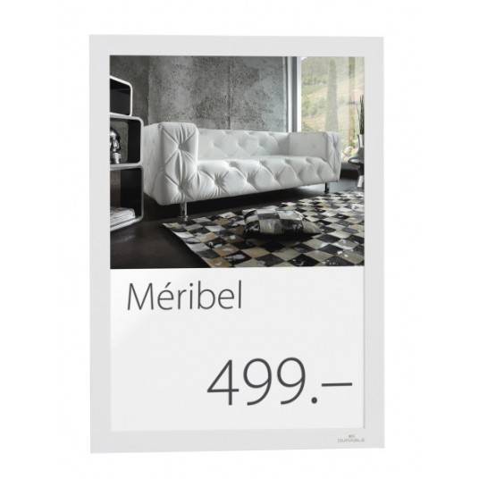 - szybka i łatwa wymiana informacji dzięki zastosowaniu uchylnej magnetycznej osłony - do zastosowania w pionie i poziomie - obustronne wykorzystanie informacji dzięki przezroczystej folii - identyczny wygląd ramki z obu stron - może być przymocowana do każdej płaskiej i stabilnej powierzchni (np. na szkle) i odklejana do ponownego zastosowania - folia nie odbijająca światła