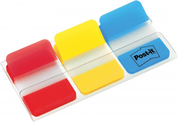 W opakowaniu 3 zestawy zakładek po 22 sztuki w rozmiarze 25,4x38mm w kolorach: czerwony, żółty, niebieski.