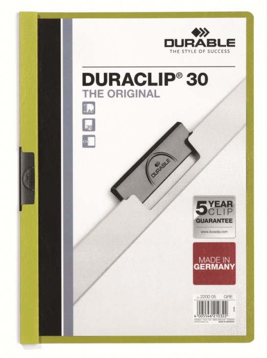 - skoroszyty A4 umożliwiające przechowywanie dokumentów bez potrzeby dziurkowania - zacisk wykonany ze specjalnej elastycznej stali - posiadają 5-letnią gwarancję na siłę docisku - przezroczysta okładka - pojemność: Duraclip 30 - 30 kartek