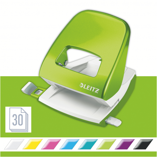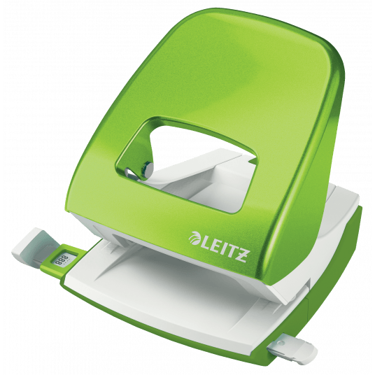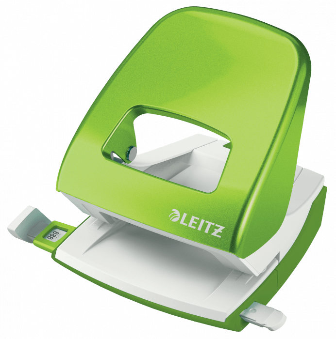 Dziurkacz Leitz WOW to mocny metalowy dziurkacz do codziennego użytku. - dziurkuje do 30 kartek (papier 80 gsm) - łatwo dopasowujący się wygodny uchwyt i wytrzymałe ostrza zmniejszają wysiłek podczas dziurkowania - wyraźne oznaczenia formatu i wytrzymała prowadnica zapewniają doskonałe wyrównanie papieru - łatwy do opróżniania pojemnik na ścinki zamontowany na zawiasach - 10-letnia gwarancja i certyfikat bezpieczeństwa GS - kolor: zielony metaliczny.