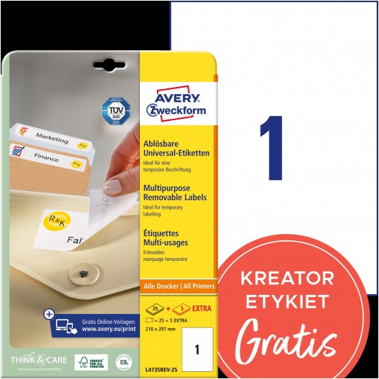 • Produkcja etykiet Avery Zweckform jest neutralna pod względem emisji CO2 (certyfikat Focus Future) i zgodna ze standardem ISO14001, który pomaga zminimalizować negatywne czynniki oddziałujące na środowisko naturalne.