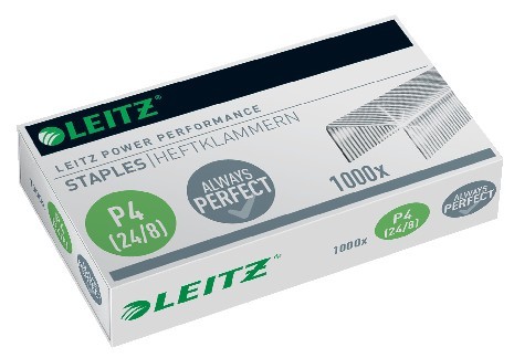Mocne, stalowe zszywki w rozmiarze 24/8. - zszywają do 40 kartek (80 gsm) - każde opakowanie zawiera 1000 zszywek - najwyższa jakość, rekomendowane do stosowania we wszystkich markach zszywaczy - długość nóżki 8 mm - do 10 lat gwarancji na zszywacze Leitz przy użyciu zszywek Leitz.