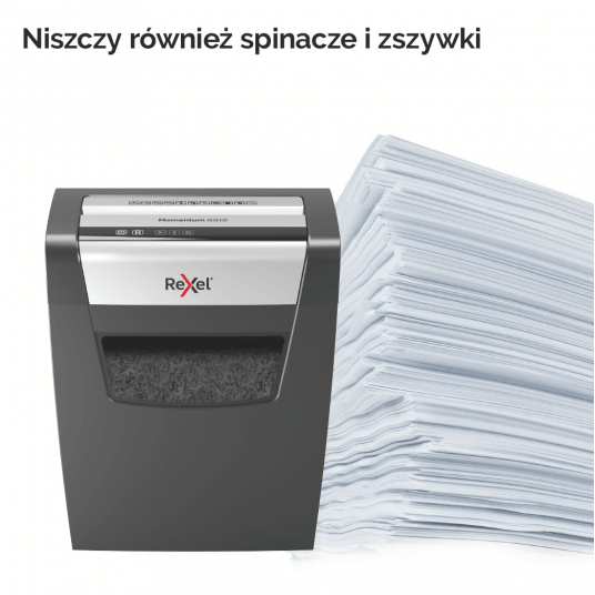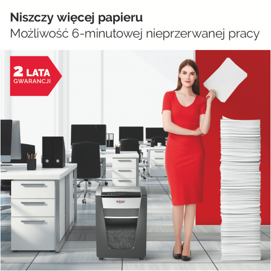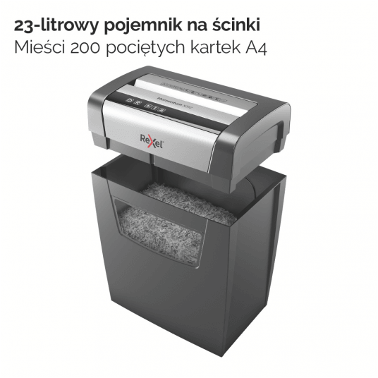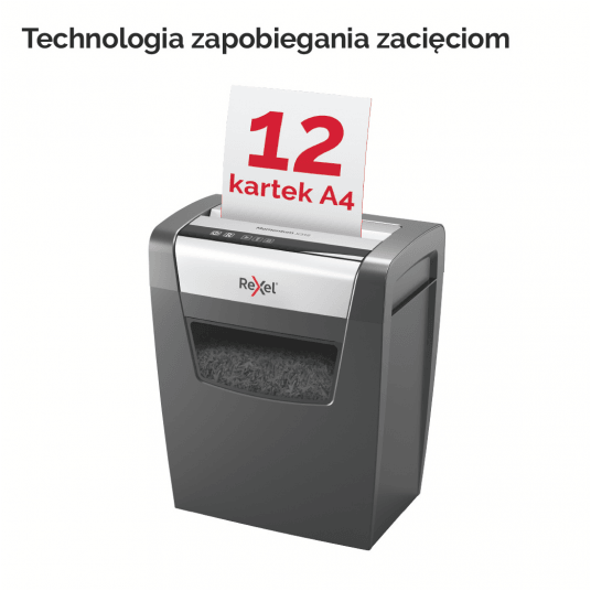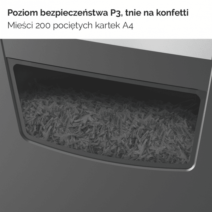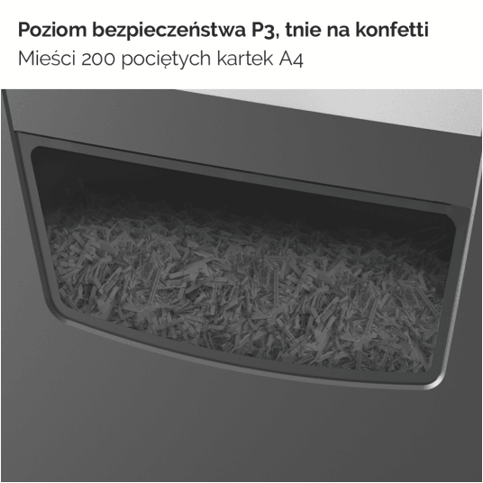 Niszczy do 12 kartek jednocześnie. Poziom bezpieczeństwa: P3 Tnie na konfetti o wymiarach 5 x 42 mm. Może pracować nieprzerwalnie przez 6 minut. Duży 23 litrowy pojemnik na ścinki pomieści do 200 kartek A4