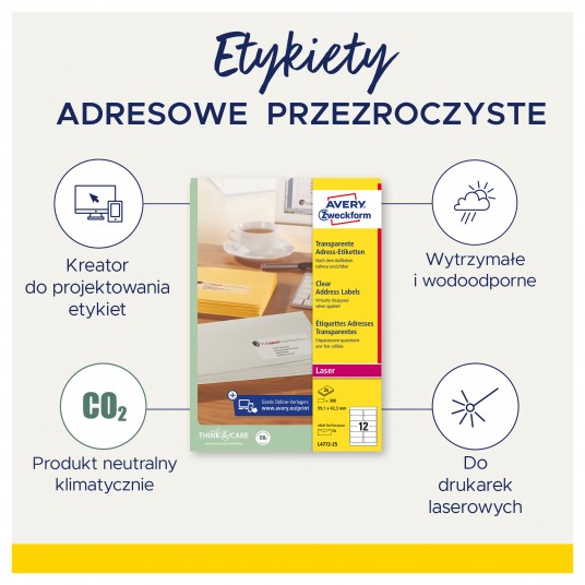 BIAŁE ETYKIETY WYSYŁKOWE NA PACZKI I PRZESYŁKI • Posiadają unikalną i nowoczesną technologię UltraGrip: trójwymiarowe paski z przodu arkusza gwarantują równomierne pobieranie i prowadzenie arkusza w drukarce. • Eleganckie etykiety z zaokrąglonymi narożnikami oraz specjalistycznym klejem trwale przylegającym do kartonów. • Wysokiej jakości papier ze specjalną powłoką zapobiega rozmazywaniu się druku nawet przy zawilgoceniu się etykiety. • Etykiety można łatwiej odrywać od arkusza i szybciej przyklejać dzięki unikatowemu systemowi QuickPEEL™. • Przeznaczone do drukarek laserowych – gwarancja braku zacięć w tych drukarkach przetestowana i zatwierdzona przez TÜV. • Ekologiczne etykiety podlegające pełnej utylizacji jako odpad papierowy. • Etykiety z certyfikatem FSC – wytworzone z papieru pochodzącego z ekologicznie zarządzanych obszarów leśnych. • Oszczędzaj czas z darmowymi i łatwymi w użyciu szablonami Avery Zweckform oraz oprogramowaniem dostępnym na stronie www.avery-zweckform.pl