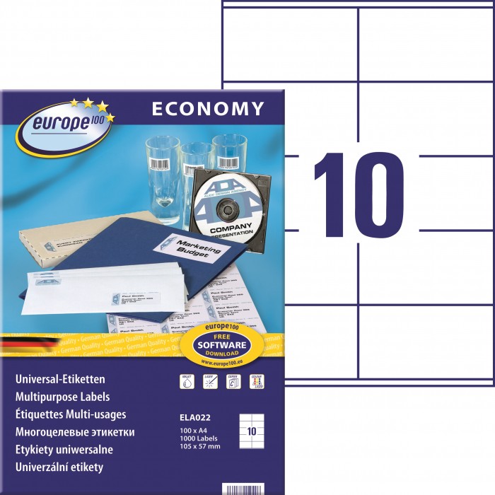 • Etykiety samoprzylepne do wszechstronnych zastosowań. • Przeznaczone do wszystkich typów drukarek atramentowych, laserowych i kserokopiarek. • Etykiety posiadają unikalną krawędź QCT, która zapobiega wydostawaniu się kleju podczas drukowania. • Chroni to delikatne elementy drukarki przed uszkodzeniem. • Kilkadziesiąt różnych rozmiarów etykiet można kupić w opakowaniach zawierających po 100 arkuszy. • Etykiety na CD/DVD są pakowane po 25 arkuszy. • Na stronie www.europe100.eumożna pobrać darmowe szablony Word do projektowania i wydruku etykiet.